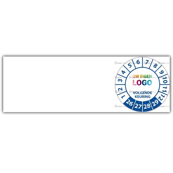 Ook voor de kabelkeuringssticker "volgende keuringsdatum" geldt dat u gratis uw eigen logo kan laten meedrukken, upload online uw logo en zie direct live de digitale drukproef.