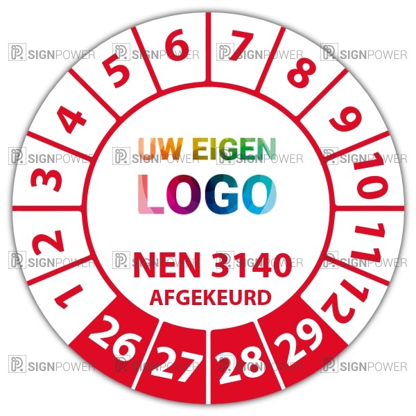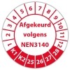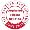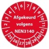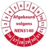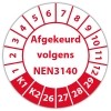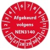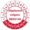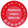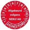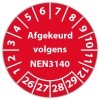 De keuringssticker "afgekeurd volgens nen 3140" heeft een diameter van 20mm, 30mm of 40mm. U kunt tevens kiezen voor een begin jaartal en het aantal keuringsstickers op rol.