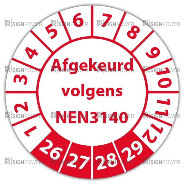 In de categorie keuringsstickers nen-normen is de keuringssticker "afgekeurd volgens nen 3140" een veel gebruikte zelfklevende sticker. Het is volgens de wet vereist dat een bewijs van de uitgevoerde keuring op de werkplek aanwezig moet zijn. Een keuringsstickers nen-normen gemaakt van een (matte) niet scheurbaar PP vinyl is daarvoor de meest praktische oplossing. Indien de sticker in aanraking komt met vocht adviseren wij een laminaatlaag over de stickers te laten aanbrengen, dit verlengt tevens de levensduur van de stickers.