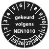De keuringssticker "gekeurd volgens nen 1010" heeft een diameter van 20mm, 30mm of 40mm. U kunt tevens kiezen voor een begin jaartal en het aantal keuringsstickers op vel.