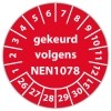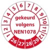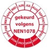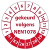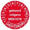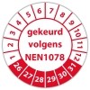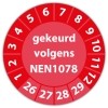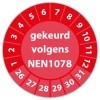 De keuringssticker "gekeurd volgens nen 1078" heeft een diameter van 20mm, 30mm of 40mm. U kunt tevens kiezen voor een begin jaartal en het aantal keuringsstickers op vel.