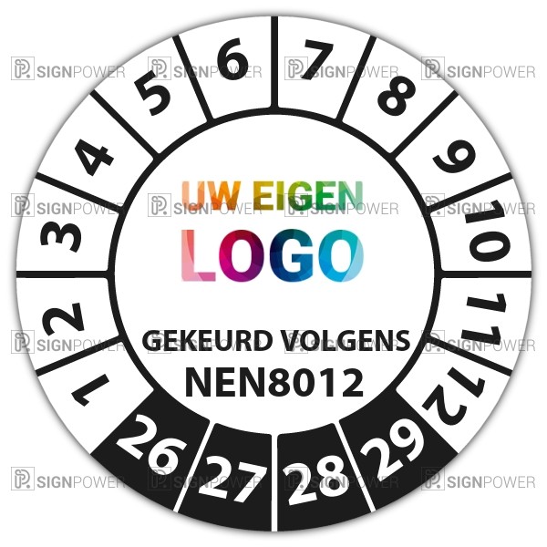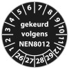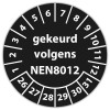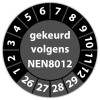 De keuringssticker "gekeurd volgens nen 8012" heeft een diameter van 20mm, 30mm of 40mm. U kunt tevens kiezen voor een begin jaartal en het aantal keuringsstickers op vel.