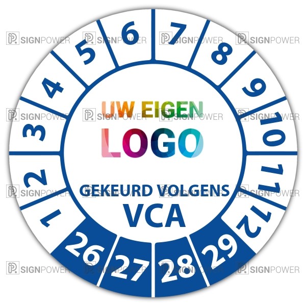 De keuringssticker "gekeurd volgens vca" heeft een diameter van 20mm, 30mm of 40mm. U kunt tevens kiezen voor een begin jaartal en het aantal keuringsstickers op vel.