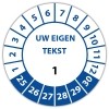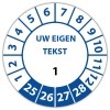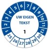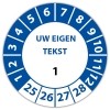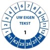 De keuringssticker genummerd met tekst heeft een diameter van 20mm, 30mm of 40mm. U kunt tevens kiezen voor een begin jaartal en het aantal keuringsstickers op rol.