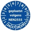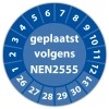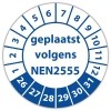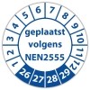 De keuringssticker "geplaatst volgens nen 2555" heeft een diameter van 20mm, 30mm of 40mm. U kunt tevens kiezen voor een begin jaartal en het aantal keuringsstickers op rol.