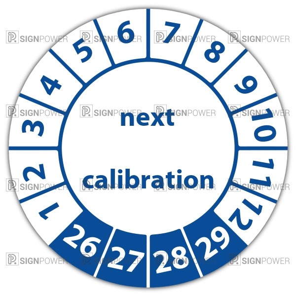 De keuringssticker "next calibration" heeft een diameter van 20mm, 30mm of 40mm. U kunt tevens kiezen voor een begin jaartal en het aantal keuringsstickers op rol.
