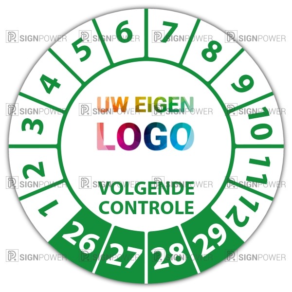 Ook voor de keuringssticker "volgende controle" geldt dat u gratis uw eigen logo kan laten meedrukken, upload online uw logo en zie direct live de digitale drukproef.