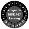 De keuringssticker "volgende nen 2767 keuring" heeft een diameter van 20mm, 30mm of 40mm. U kunt tevens kiezen voor een begin jaartal en het aantal keuringsstickers op vel.