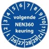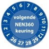 De keuringssticker "volgende nen 360 keuring" heeft een diameter van 20mm, 30mm of 40mm. U kunt tevens kiezen voor een begin jaartal en het aantal keuringsstickers op rol.