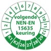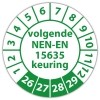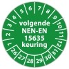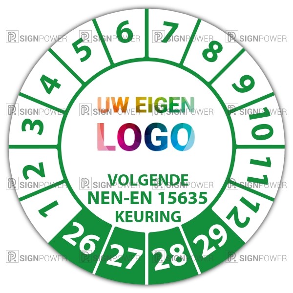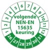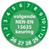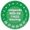 De keuringssticker "volgende nen-en 15635 keuring" heeft een diameter van 20mm, 30mm of 40mm. U kunt tevens kiezen voor een begin jaartal en het aantal keuringsstickers op rol.
