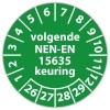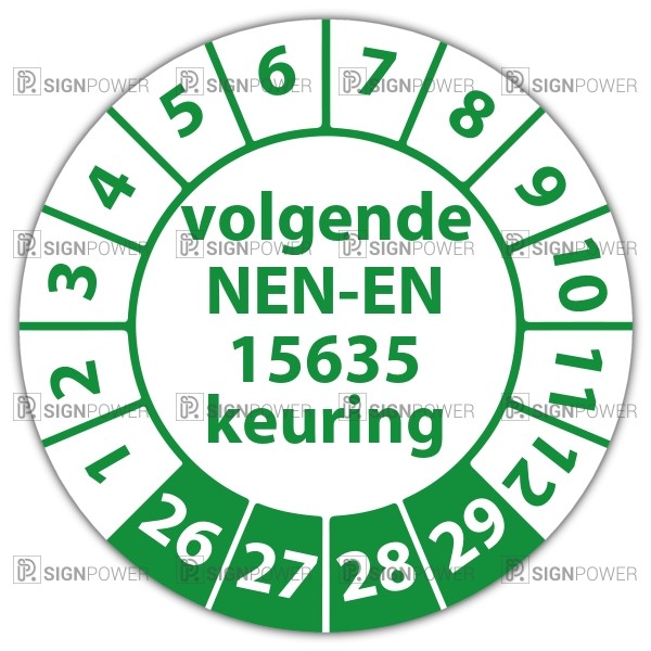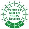 In de categorie keuringsstickers op rol is de keuringssticker "volgende nen-en 15635 keuring" een veel gebruikte zelfklevende sticker. Het is volgens de wet vereist dat een bewijs van de uitgevoerde keuring op de werkplek aanwezig moet zijn. Een keuringsstickers op rol gemaakt van een (matte) niet scheurbaar PP vinyl is daarvoor de meest praktische oplossing. Indien de sticker in aanraking komt met vocht adviseren wij een laminaatlaag over de stickers te laten aanbrengen, dit verlengt tevens de levensduur van de stickers.