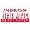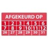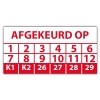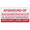 In de categorie kunt u zelf de tekst kleur en lettertype bepalen. Rechthoek, ovaal, rond of vierkant in diverse maten. De keuringssticker "afgekeurd op" is gedrukt op een (matte) zelfklevend niet scheurbaar PP vinyl. Ten op zichte van papieren stickers zijn deze watervast. Uw stickers worden afgeleverd in een handig doosje