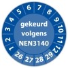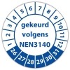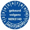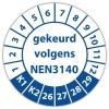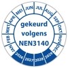 In de categorie kunt u zelf de tekst kleur en lettertype bepalen. Rechthoek, ovaal, rond of vierkant in diverse maten. De keuringssticker "gekeurd volgens nen 3140" is gedrukt op een (matte) zelfklevend niet scheurbaar PP vinyl. Ten op zichte van papieren stickers zijn deze watervast. Uw stickers worden afgeleverd in een handig doosje