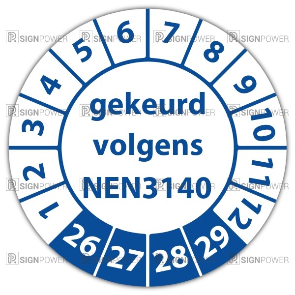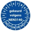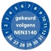 keuringssticker voor het keuren /controleren van elektrische installaties als gereedschappen, machines volgens de norm NEN3140 te leveren op zelfklevend vinyl . standaard uitvoering of met eigen tekst en/of logo in diverse vormen en maten