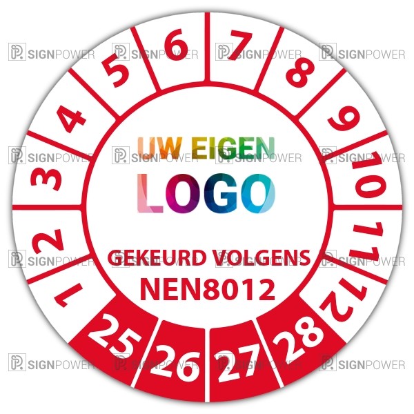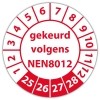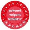 In de categorie kunt u zelf de tekst kleur en lettertype bepalen. Rechthoek, ovaal, rond of vierkant in diverse maten. De keuringssticker "gekeurd volgens nen 8012" is gedrukt op een (matte) zelfklevend niet scheurbaar PP vinyl. Ten op zichte van papieren stickers zijn deze watervast. Uw stickers worden afgeleverd in een handig doosje