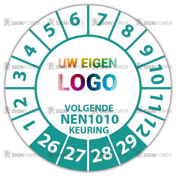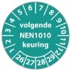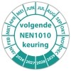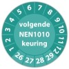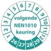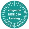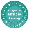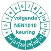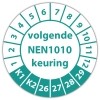 In de categorie kunt u zelf de tekst kleur en lettertype bepalen. Rechthoek, ovaal, rond of vierkant in diverse maten. De keuringssticker "volgende nen 1010 keuring" is gedrukt op een (matte) zelfklevend niet scheurbaar PP vinyl. Ten op zichte van papieren stickers zijn deze watervast. Uw stickers worden afgeleverd in een handig doosje