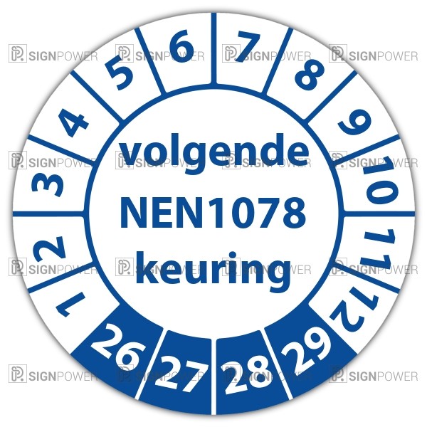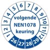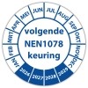 In de categorie kunt u zelf de tekst kleur en lettertype bepalen. Rechthoek, ovaal, rond of vierkant in diverse maten. De keuringssticker "volgende nen 1078 keuring" is gedrukt op een (matte) zelfklevend niet scheurbaar PP vinyl. Ten op zichte van papieren stickers zijn deze watervast. Uw stickers worden afgeleverd in een handig doosje