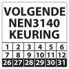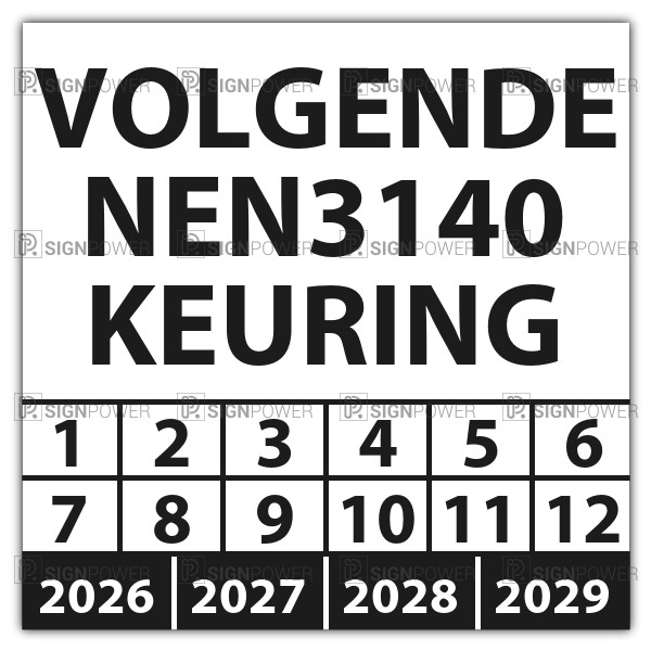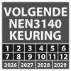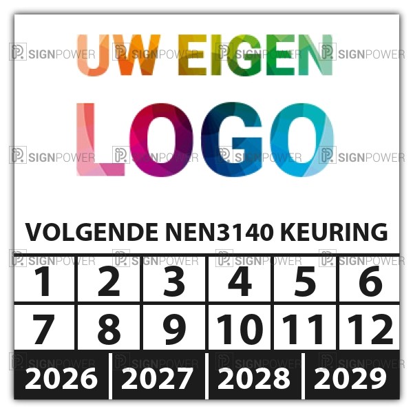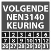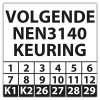 In de categorie kunt u zelf de tekst kleur en lettertype bepalen. Rechthoek, ovaal, rond of vierkant in diverse maten. De keuringssticker "volgende nen 3140 keuring" is gedrukt op een (matte) zelfklevend niet scheurbaar PP vinyl. Ten op zichte van papieren stickers zijn deze watervast. Uw stickers worden afgeleverd in een handig doosje